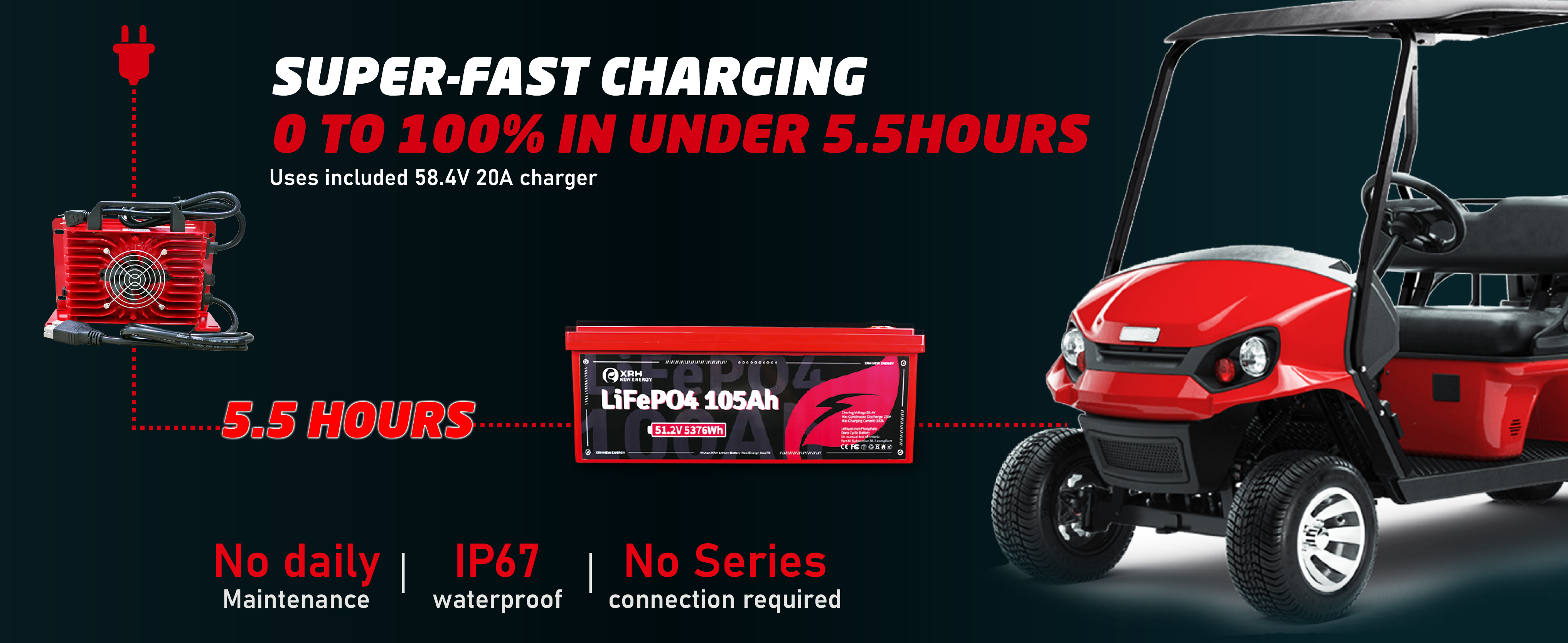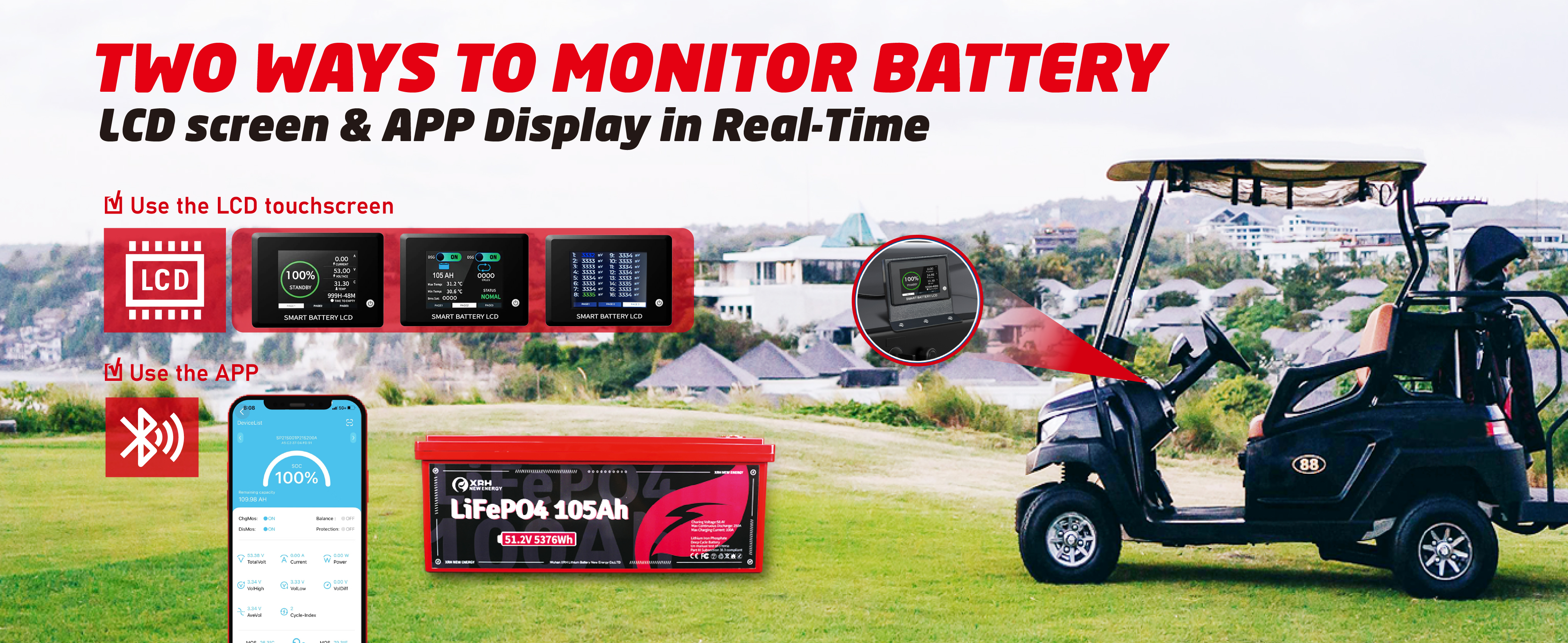 48V(51.2V) LiFePO4 Lithium Golf Cart Battery Built-in 250A BMS,with 48V 20A Lithium Battery Charger,Mobile APP,Touch Monitor,Port Plug and retention strap,6000+ Cycles,Perfect for Golf Carts (Plastic)